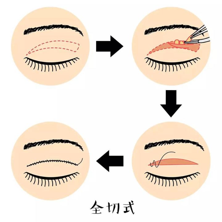 全切法适合所有人,这也是最经典的手术方式。它可以在做双眼皮的同时,可以将多余的脂肪和皮肤去掉,肿泡眼的人还可以同时去除多余皮肤、眶隔脂肪、Roof、眼轮匝肌等组织。