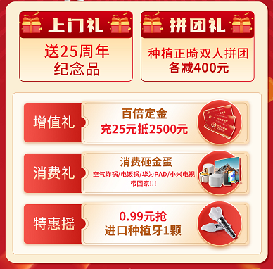 4.充值送:市民到院充值25元可抵换2500元,种牙、矫正、修复等通用。