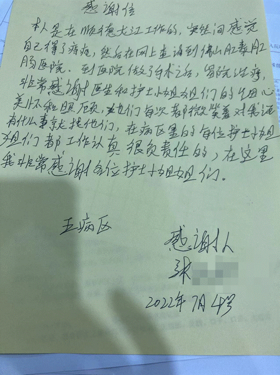 术后经过近一周的康复治疗,张女士在6月底顺利康复出院。7月初,张女士为了表示自己内心的感谢,将一封自己亲笔写的感谢信送到了医院医护人员的手中,感谢佛山肛泰肛肠医院的医护团队帮他治好了多年的混合痔顽疾。