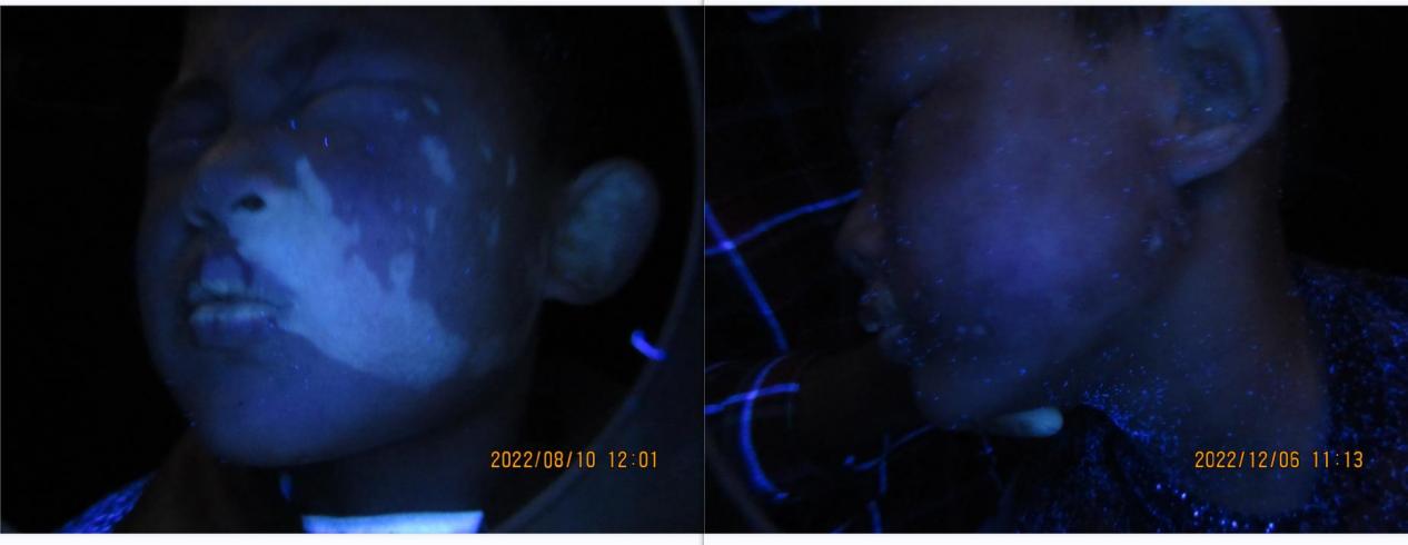 首先,针对白斑区域进行局部的照光治疗,通过美国308nm准分子激光对白斑区域的照射,促进皮下黑色素细胞分裂成活,达到复色的效果。同时,为患者提供调免药物,通过药物调节患者自身免疫力,由内而外地控制白斑发展进程。在经过三个月的治疗后,这位患者的面部白斑已经得到控制,且已经基本复色。