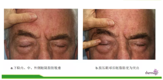 随年龄的增加,上下眼睑皮下脂肪和眶周脂肪垫会发生肥厚性或萎缩性改变。对于上下睑凹陷,我们可联合脂肪移植/填充剂进行眶周区域或眼睑填充,以恢复年轻饱满的状态,在进行治疗前需提前告知患者。同时在进行热玛吉操作时,凹陷区域不可过多覆盖。