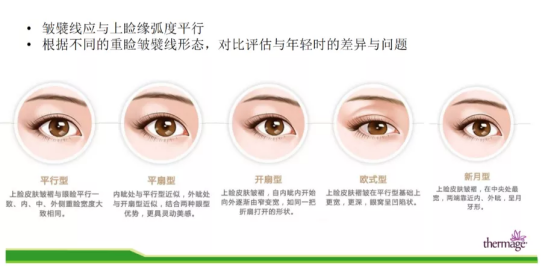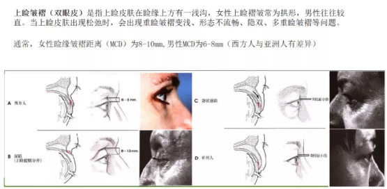 女性上睑褶皱常为拱形,男性往往较直。通常,女性睑缘皱褶距离(MCD)为8-10mm,男性MCD为6-8mm,上睑皱褶高度还需要考虑种族差异,亚洲人的上睑皱褶较低,并且常常没有上睑皱褶。当上睑皮肤出现松弛时,会出现重睑皱褶变浅、形态不流畅、隐双、多重睑皱褶等问题。
