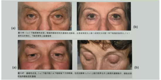 患者上睑皮肤松弛、假性上睑下垂、腱膜前脂肪垫假性脱垂引起上睑臃肿,下睑眶脂肪垫脱垂