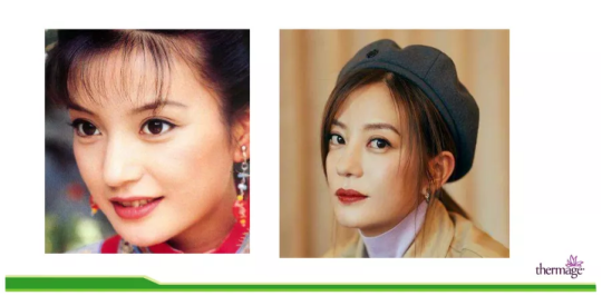 例如以上明星,年轻时上睑皱褶形态是平行型随着年龄的增加上睑褶皱形态成为新月型,主要是由于上睑中外侧皮肤松弛下垂,眼轮轧肌后脂肪(ROOF)下移,所以在治疗过程中我们会将上睑外侧作为问题区,ROOF作为锚定点进行操作来改善问题。