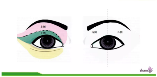 如果通过瞳孔中心绘制假想的垂直线,将上睑一分为二,我们认为内侧部分的老化与上睑皮肤松弛有关,而外侧则有眉下垂的因素影响。