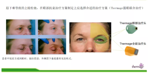 我们常用的评估方式是让患者平视前方或闭眼,提拉外侧眉部。若外侧眼睑皮肤松弛可见明显改善,则建议联合提眉治疗方式联合,提高疗效及满意度。
