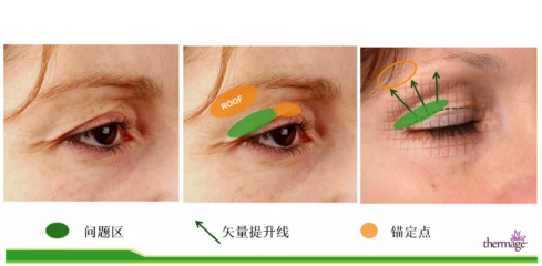 矢量提升线:外侧上睑褶皱至眉弓、眉尾