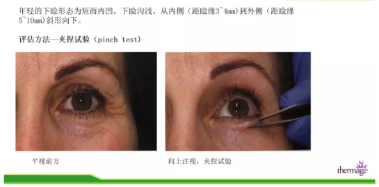 在评估下睑皮肤松弛方法上可使用夹捏试验(pinchtest),嘱患者张嘴并向上注视。若下睑松弛的皮肤能够用镊子夹捏,且不造成下睑缘外翻,则说明下睑皮肤松弛。