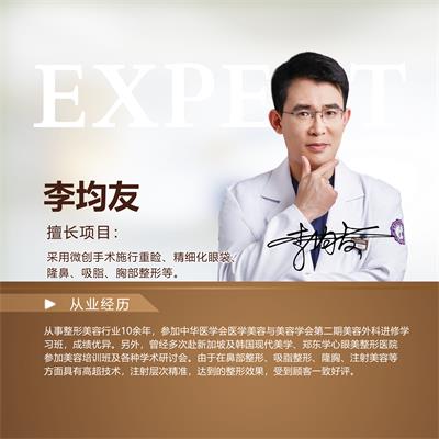 李均友、徐州医科汇美美容医院技术院长、美容外科主诊医师。擅长项目:对采用微创手术施行重睑、精细化眼袋、隆鼻、隆下颌等面部精雕手术,面部除皱的注射填充、肉毒素除皱等医疗技术有独到之处。尤其擅长精细手术。眼部综合美眼,失败眼以及眼型修复术,眼袋支持韧带矫正术,鼻部综合翘鼻术,体型雕塑,自体脂肪移植,假体隆胸等。